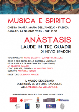 È in programma per sabato 24 giugno, alle ore 21 nella chiesa di Santa Maria dell’Angelo di Faenza, lo spettacolo Anàstasis, Laude in tre quadri di Nevio Spadoni promossa dal Museo diocesano di Faenza, nell’ambito della rassegna Musica e Spirito. Le offerte raccolte durante la serata saranno destinate all’emergenza alluvione. Lo spettacolo è diretto da direttore Giuliano Amadei, con le voci narranti di Nevio Spadoni ed Elisabetta Rivalta, il coro ed orchestra della Cappella musicale della basilica di San Francesco di Ravenna, il coro Jubilate di Faenza, ed il soprano Annarita Venieri. La rassegna Musica e Spirito è promossa dal Museo diocesano di Faenza in collaborazione con il comune di Faenza, la Scuola comunale di musica Sarti, la Biblioteca diocesana Gaetano Cicognani, la Scuola arti e mestieri Angelo Pescarini, la Cappella musicale della basilica San Francesco di Ravenna, il coro polifonico Jubilate, Associazione musicale Fattorini, Mosaici sonori, Centro dantesco O.F.M. Conv. Ravenna. Nella chiesa di Santa Maria dell’Angelo di Faenza è ancora esposta la mostra Anàstasis, visitabile fino al 2 luglio da mercoledì a domenica dalle ore 10 alle ore 12,30 e dalle ore 16,30 alle ore 19. Info: www.museodiocesanofaenza.it – 333 783 4993