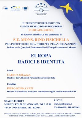 “Europa, radici e identità”: è il titolo della relazione che mons. Rino Fisichella, pro-prefetto del dicastero per la Evangelizzazione e organizzatore del Giubileo 2025, terrà mercoledì 28 giugno alle 17.30 presso lo “Spazio Europa” di “Europa, radici e identità” a Roma. L’iniziativa è dell’Istituto universitario di studi europei. Sono stati invitati membri del governo e parlamentari, giudici costituzionali e dirigenti pubblici, ambasciatori dei Paesi europei, esponenti del mondo dell’economia e del lavoro.
