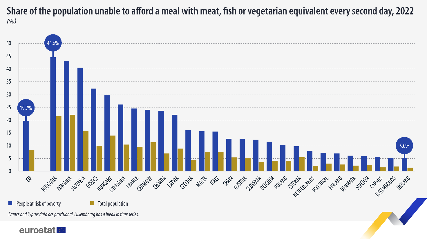 Il 19,7% delle persone nell’Ue è a rischio povertà e l’8,3% della popolazione non può permettersi di mangiare carne, pesce o un equivalente vegetariano ogni due giorni. Sono dati pubblicati oggi da Eurostat, l’ufficio europeo di statistica, relativi al 2022; e sono percentuali in crescita rispetto al 2021: il 2,2% di persone è a rischio povertà, l’1% in più fatica a mangiare bene. La percentuale italiana di persone che hanno di fatto una dieta povera in ragione di difficoltà economiche è pari al 7,5% della popolazione, mentre a rischio povertà è una fetta che corrisponde al 15,5%. In ambito Ue, la situazione più pesante è in Bulgaria, dove a rischio povertà e senza alimentazione adeguata è il 44,6% della popolazione; difficile il quadro anche per la Romania (43,0%) e la Slovacchia (40,5%). Le percentuali più basse relativamente al rischio di povertà, incrociato al dato della povertà alimentare, sono registrate in Irlanda (5,0%), Lussemburgo (5,1%) e Cipro (5,6%). Spiega Eurostat che l’elemento “alimentazione” (e nello specifico un pasto a base di carne, pollo, pesce o vegetariano ogni due giorni) “è uno degli indicatori principali nella valutazione relativa ai principi del pilastro europeo dei diritti sociali”, nonché degli obiettivi di sviluppo sostenibile.