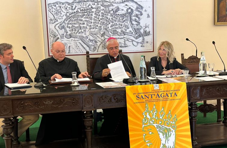 Si è svolta stamattina la conferenza stampa per la presentazione del programma della festa estiva di Sant’Agata 2023, in presenza dell’arcivescovo di Catania, mons. Luigi Renna, del parroco della basilica cattedrale, mons. Barbaro Scionti, e della presidente del Comitato per la festa di Sant’Agata, Mariella Gennarino. Le celebrazioni estive in onore di Sant’Agata inizieranno mercoledì 2 agosto, primo mercoledì del mese, con la santa messa delle ore 10 e la presentazione dinanzi al sacello delle preghiere dei devoti. Sabato 12 agosto ci sarà la festa di Sant’Euplio, compatrono di Catania. Alle ore 9 avverrà la traslazione del braccio reliquiario di Sant’Euplio dalla cattedrale al sito dell’antica chiesa a lui dedicata e distrutta dai bombardamenti della seconda guerra mondiale. Saranno celebrate messe alle ore 7,30 ed alle ore 10, messa solenne alle ore 18 presieduta dall’ arcivescovo emerito di Siracusa, mons. Salvatore Pappalardo, con la partecipazione dei diaconi dell’arcidiocesi. La sera di domenica 13 agosto il velo di Sant’Agata sarà traslato a Mompileri, al santuario della Madonna della Sciara, in occasione del giubileo centenario della erezione del santuario diocesano. Le celebrazioni agatine poi si svolgeranno secondo le tradizionali consuetudini dal 16 agosto con l’ esposizione del velo di Sant’Agata nella basilica cattedrale di Catania per l’intera giornata, la messa e la processione serale. Il 17 agosto, memoria dell’897° anniversario del ritorno in patria delle reliquie di Sant’Agata da Costantinopoli, verranno esposti dalle 8 del mattino il busto reliquiario e le reliquie della Santa Patrona. Ci saranno messe, confessioni e benedizioni per l’intera giornata (alle ore 7,30, 9, 10, 11, 12, 13, 15, 16, 17). In particolare alle ore 10 la santa messa sarà presieduta da mons. Luigi Roberto Cona, nunzio apostolico in El Salvador. Alle 19 ci sarà poi la messa solenne presieduta dall’arcivescovo di Catania e la processione intorno all’isolato della cattedrale. Novità del 2023 è che le processioni saranno animate con preghiere, canti ed invocazioni attraverso impianto di amplificazione per tutto il tragitto. Un maxi schermo sarà in piazza Duomo per dare ai fedeli maggiore possibilità di partecipazione. Si ripristina inoltre la venerazione da parte dei fedeli delle reliquie della Santa Patrona, dopo le necessarie restrizioni del periodo Covid.