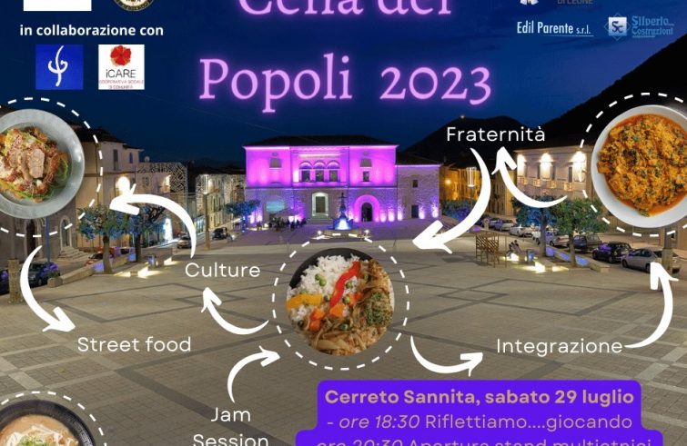 È in programma per oggi, a partire dalle ore 18,30 in piazza San Martino a Cerreto Sannita, la seconda edizione della “Cena dei Popoli”, serata di fraternità e condivisione culturale multietnica, attraverso le specialità culinarie dei Paesi di origine di persone di altre etnie presenti nella comunità e nei paesi limitrofi. L’evento è organizzato dall’Azione cattolica interparrocchiale di Cerreto Sannita, in collaborazione con il Forum dei giovani, la Cooperativa sociale di comunità iCare, e con il patrocinio del Comune di Cerreto Sannita, con lo scopo di offrire un’occasione per conoscere meglio tante famiglie che abitano nel territorio. La serata inizierà alle ore 18,30 con delle attività culturali che, attraverso il gioco, vogliono evidenziare gli aspetti dell’integrazione e del rispetto tra culture diverse. Dalle ore 20,30 saranno cucinati e serviti negli stand alcuni piatti tipici europei e subsahariani, mentre si esibirà la band “Gravity Bump” di Gioia Sannitica.