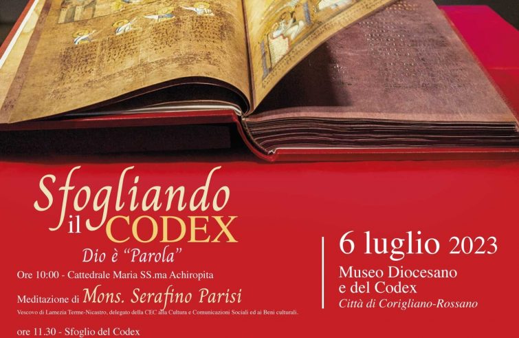 È in programma per giovedì 6 luglio, alle 11.30 a Rossano nel Museo diocesano e del Codex, l’evento “Sfogliando il Codex”, momento di riflessione destinato a sacerdoti, religiose e religiosi della diocesi di Rossano-Cariati, presieduto da mons. Serafino Parisi, vescovo di Lamezia Terme, e delegato alla Cultura e comunicazioni sociali ed ai Beni culturali della Conferenza episcopale calabra. Un appuntamento che si inserisce nell’ambito delle iniziative organizzate per celebrare i 70 anni del Museo diocesano e del Codex e che, per volere del vescovo di Rossano-Cariati, mons. Maurizio Aloise, inizierà prima dello sfoglio dell’evangelario Codex Purpureus Rossanensis con una meditazione di mons. Parisi sulla miniatura del “cieco nato”, in programma alle 10 nella cattedrale di Maria Santissima Achiropita.