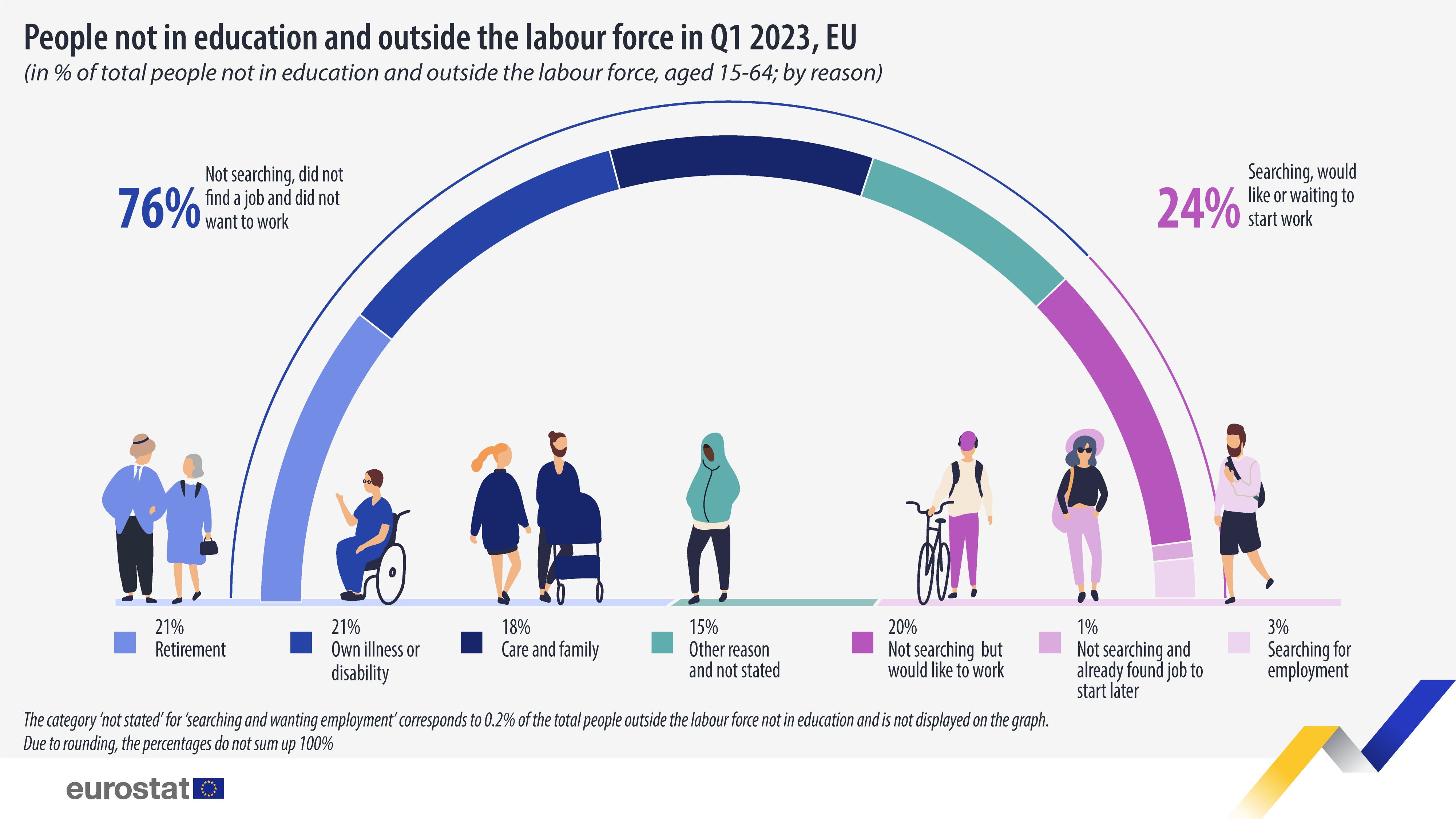 Nel primo trimestre del 2023 il 18,2% delle persone tra i 15 e i 64 anni di età, che non studiavano, non rientrava neanche nella forza lavoro nell’Ue. Tra i Paesi Ue, la Romania e l’Italia hanno registrato la quota più elevata di persone al di fuori della forza lavoro tra coloro che non hanno un’istruzione rispettivamente con il 25,8% e il 25,6%. Seguono Grecia (22,8%), Croazia (21,8%) e Belgio (19,6%). Le quote più basse sono state registrate in Svezia (8,3%), Estonia (12,3%) e Repubblica Ceca (13,6%). Lo comunica Eurostat in una pubblicazione odierna. Nel primo trimestre 2023 nell’Ue, nella fascia di età presa in esame, tra le persone che non hanno seguito un corso di studi, poco più di 8 su 10 erano nella forza lavoro (81,8%), di queste il 76,7% era occupato e il 5,1% era disoccupato. Inoltre, secondo l’analisi sulla forza lavoro nell’Ue (Eu-Lfs3), dei 44 milioni di persone non istruite e al di fuori della forza lavoro nel primo trimestre del 2023, “il 77,8% non cercava un lavoro, non lo aveva trovato e non voleva lavorare”. Mentre, “il 20,3% non lo cercava ma voleva comunque lavorare, il 2,8% lo cercava attivamente ma non era immediatamente disponibile, e l’1,2% non lo cercava ma aveva trovato un lavoro da iniziare in seguito”. Tra le persone non istruite e fuori dalla forza lavoro, “il 21,1% non voleva lavorare perché era in pensione, il 20,7% per malattia o disabilità e il 18,2% per responsabilità di assistenza o altri motivi familiari”.