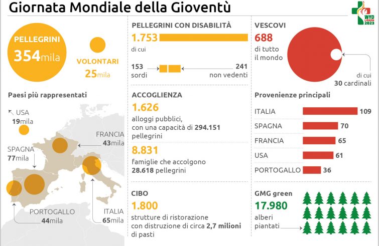 Lisbona si prepara a diventare per i prossimi giorni la “capitale” mondiale dei giovani. Una marea umana ha riempito la Colina do Encontro, “invadendo” tutto il Parque Eduardo VII e la piazza Marques de Pombal. Si sono dati appuntamento qui per la messa presieduta dal cardinale patriarca di Lisbona, Manuel Clemente, che ha ufficialmente aperto questa sera la Giornata mondiale della gioventù a Lisbona. Si parte così ed è solo l’inizio. Sono ad oggi 354mila i pellegrini registrati e più di 25mila volontari alla Giornata mondiale della gioventù di 140 Paesi del mondo. I dati sono stati diffusi oggi, in conferenza stampa. I Paesi più rappresentati sono la Spagna con 77.224 pellegrini. Seguono, in seconda posizione, l’Italia con 65 mila giovani, il Portogallo con 43.742 e la Francia con 42.482. Hanno voluto essere presenti anche 688 vescovi di tutto il mondo, di cui 30 cardinali. Dall’Italia sono arrivati 109 presuli, dalla Spagna 70, dalla Francia 65, dagli Stati Uniti 61 e dal Portogallo 36. La Gmg di Lisbona registra anche una “grande partecipazione” di pellegrini provenienti dai Paesi di lingua portoghese: da Brasile (5.826), Angola (752), Capo Verde (940), São Tomé e Príncipe (513), Mozambico (312), Guinea- Bissau (122) e Timor Est (62). Una imponente macchina organizzativa ha reso possibile la realizzazione di un evento con numeri di questa portata. Sono 1.753 i pellegrini con disabilità (di cui 153 sordi e 241 non vedenti). La Gmg Lisbona 2023 dispone di 1.626 alloggi pubblici, con una capacità di 294.151 pellegrini, e 8.831 sono le famiglie che hanno aperto le porte delle loro case per accogliere 28.618 pellegrini. Per quanto riguarda il cibo, sono 1.800 le strutture di ristorazione che hanno aderito alla Gmg consentendo la distruzione di circa 2,7 milioni pasti convenzionati. Per quanto riguarda il Festival della Gioventù, si contano più di 600 eventi con più di 2.500 partecipanti in 90 località. Ma la Gmg si è prefissata anche una missione “green”: 17.980 sono gli alberi piantati e dedicati alla Gmg Lisbona 2023.