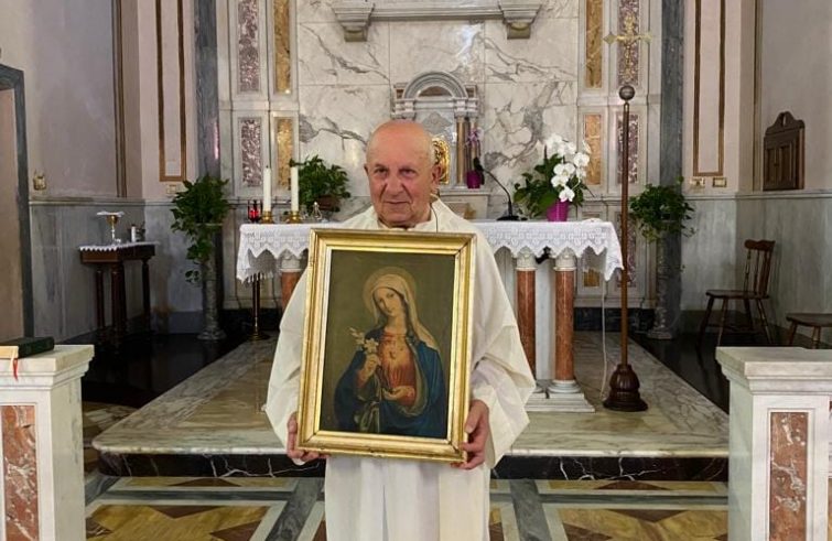 “Dopo i festeggiamenti della seconda incoronazione della Vergine Santissima della Civita luglio 1877 – ha raccontato padre Cherubino – una delegazione del clero itrano, parroci e dignità capitolari, si recò nell’agosto a Roma per ringraziare Pio IX per la concessione della suddetta incoronazione. Il Santo Padre commosso ringraziò i presenti ricordando il suo pellegrinaggio al Monte Civita il 10 febbraio e 1849 e volle donare loro una modesta immagine del Cuore Immacolato di Maria che da poco aveva ricevuto”. Pio IX morirà santamente il 7 febbraio 1878. Il Papa ordinò di tenere il quadro in venerazione ricordandosi della sua persona. Il quadro fu portato in Itri ed esposto accanto all’altare maggiore della chiesa di Santa Maria extra moenia, nel centro storico di Itri. Da allora si iniziò a celebrare una la festa in onore di Maria Regina con processione il 22 agosto, nell’ ottava dell’Assunta. Dalla chiesa parrocchiale di Santa Maria il quadro fu poi trasferito al Monastero delle Monache Benedettine e successivamente consegnato alle Monache Passioniste fino al 1944. Quando la chiesa fu distrutta dai bombardamenti e quasi tutti gli arredi sacri furono, dispersi, solo poche cose furono salvate tra cui il quadretto della Madonna di cui si prese cura la famiglia Mancini che lo donò a padre Di Feo, passionista, che lo ha custodito con grande cura in questi 60 anni ed ora esposto al culto dei fedeli nella chiesa dei Passionisti di Itri-città. Occasione più adatta per tale esposizione di un’icona mariana di Pio IX è stata la festa della Madonna Regina di oggi 22 agosto 2023.