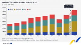 Nel 2022, 3,7 milioni di cittadini non Ue hanno ottenuto per la prima volta un permesso di soggiorno in un Paese dell’Unione. La cifra, rispetto al 2021, segna un più 26%, ed è la più alta dal 2009. Eurostat, l’istituto europeo di statistica, specifica: “il dato non comprende le persone a cui è stata concessa protezione temporanea nell’Ue in seguito all’invasione russa in Ucraina”. Ad attirare persone in Europa sono innanzitutto “motivi di lavoro”: la fetta rappresenta il 42% di tutti i permessi di primo soggiorno rilasciati nel 2022, e corrisponde a 1,6 milioni di permessi (+18% rispetto al 2021); seguono i “motivi familiari” (24%) e poi gli “altri motivi” (protezione internazionale, 21%, e studio, 13%). La Germania è il Paese Ue che ha rilasciato più permessi (il 15% del totale, cioè 538.690), ma è anche il Paese in cui si è registrato il maggiore incremento rispetto al 2021 (+190%), principalmente per l’aumento di permessi rilasciati per motivi familiari. Al secondo posto della classifica dei numeri assoluti di permessi rilasciati c’è la Spagna (12%; 457.412 permessi;), poi l’Italia (9%; 337.788) e quindi la Francia (9%; 324.200). Invece i Paesi dove l’incremento di permessi rilasciati è stato maggiore, dopo la Germania, sono Malta (+164%; 37.851) Irlanda (+146%; 85.793). Sono calati sensibilmente i permessi rilasciati in Repubblica Ceca (-28%; da 74.395 a 53.809), Slovacchia (-6%; da 29.067 a 27.441) e Ungheria (-1 %; da 58.115 a 57.286).
