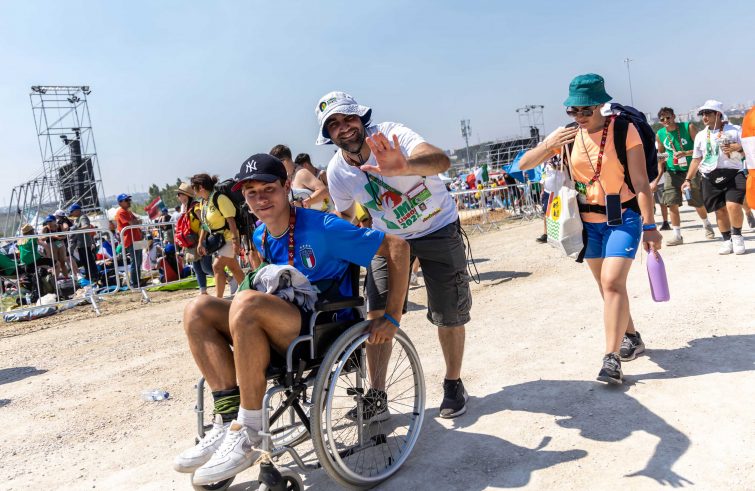 Adele tiene la testa tra le mani dal primo pomeriggio. Seduta sulla sua carrozzina, sta reclinata in avanti. “Prega”, dice Francis, il volontario che la accompagna. Al Parque Tejo di Lisbona, dove è in corso la veglia dei giovani della Gmg con il Papa, è disponibile un’area – sulla destra del palco – specificamente dedicata alle persone con disabilità o difficoltà motoria. Ne sono arrivate a centinaia. Lunghe file di carrozzine si alternano a sedie dove sono accomodati, insieme, giovani, adulti e diversi anziani. Un gruppo ritardatario (“non sai che fatica abbiamo fatto per arrivare fino a qui”, spiega Maria) entra nell’area fra saluti, abbracci, risate. “È bello essere qui”, afferma John, appoggiandosi alle stampelle che, mi spiega, lo sostengono da quando era piccolo. È alla sua seconda Gmg. “Voglio sempre venire alla Gmg. Ci sono i giovani. E c’è il Papa!”.