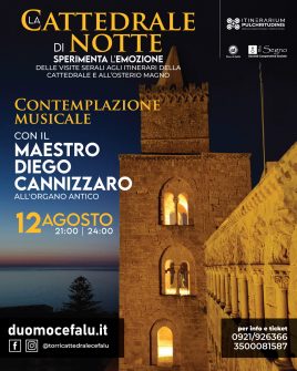 Prosegue il programma delle visite serali dalle ore 21 alle 24 alla cattedrale di Cefalù e all’Osterio Magno che, in occasione della serata del 12 agosto, propone l’accompagnamento musicale di Diego Cannizzaro all’organo antico della chiesa. Il percorso completo (12 euro intero – 9 euro ridotto), prevede la visita della torri e dei tetti della cattedrale, la sacrestia, il tesoro, il salone Sansoni, la cappella vescovile, il chiostro canonicale e l’Osterio Magno, con al suo interno la mostra Spiritus Hominis. Informazioni e prenotazioni sul sito www.duomocefalu.it – email info@duomocefalu.it – tel. 0921/926366 – 3500081587.