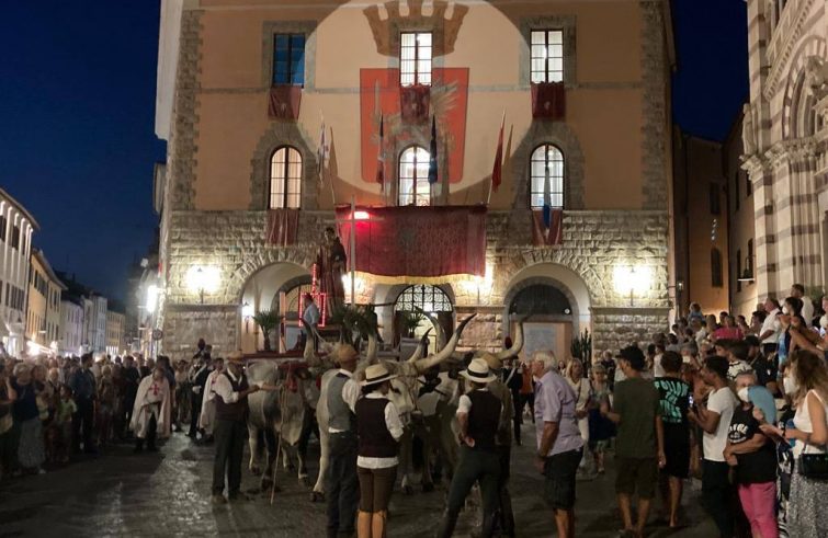 La statua del santo, patrono della città e della diocesi di Grosseto, collocata sul caratteristico carroccio decorato, trainato da Tiburzi e Fioranti, coppia di buoi maremmani di 9 anni, di proprietà dell’allevatore Loriano Bargagli, titolare dell’azienda Badia vecchia, seguirà il percorso tradizionale: piazza Duomo, piazza Dante, strada Ricasoli, Porta Vecchia, piazza De Maria, via Battisti, via Bengasi, via Tripoli, via Oberdan, piazza Rosselli, via Fallaci, corso Carducci, per concludersi in piazza Duomo, da dove sarà impartita la benedizione sulla città e sulla diocesi di Grosseto con la reliquia del giovane martire.