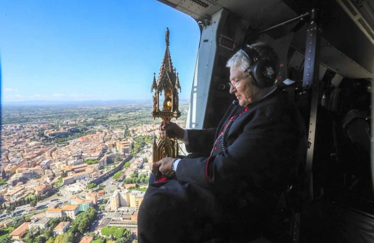 Questa mattina il cuore di santa Rosa ha spiccato il volo a bordo di un elicottero dell’Esercito per benedire dall’alto tutti i suoi fedeli. Il vescovo di Viterbo Orazio Francesco Piazza, con alcune delle principali autorità locali, si è recato presso l’eliporto Chelotti, dove l’elicottero NH-90, era pronto al decollo per compiere il sorvolo di Viterbo, Bagnaia, Grotte Santo Stefano, Soriano, San Martino al Cimino e Vitorchiano e i luoghi della fragilità, quali il Carcere, l’Ospedale Belcolle e le cliniche di malati e anziani.