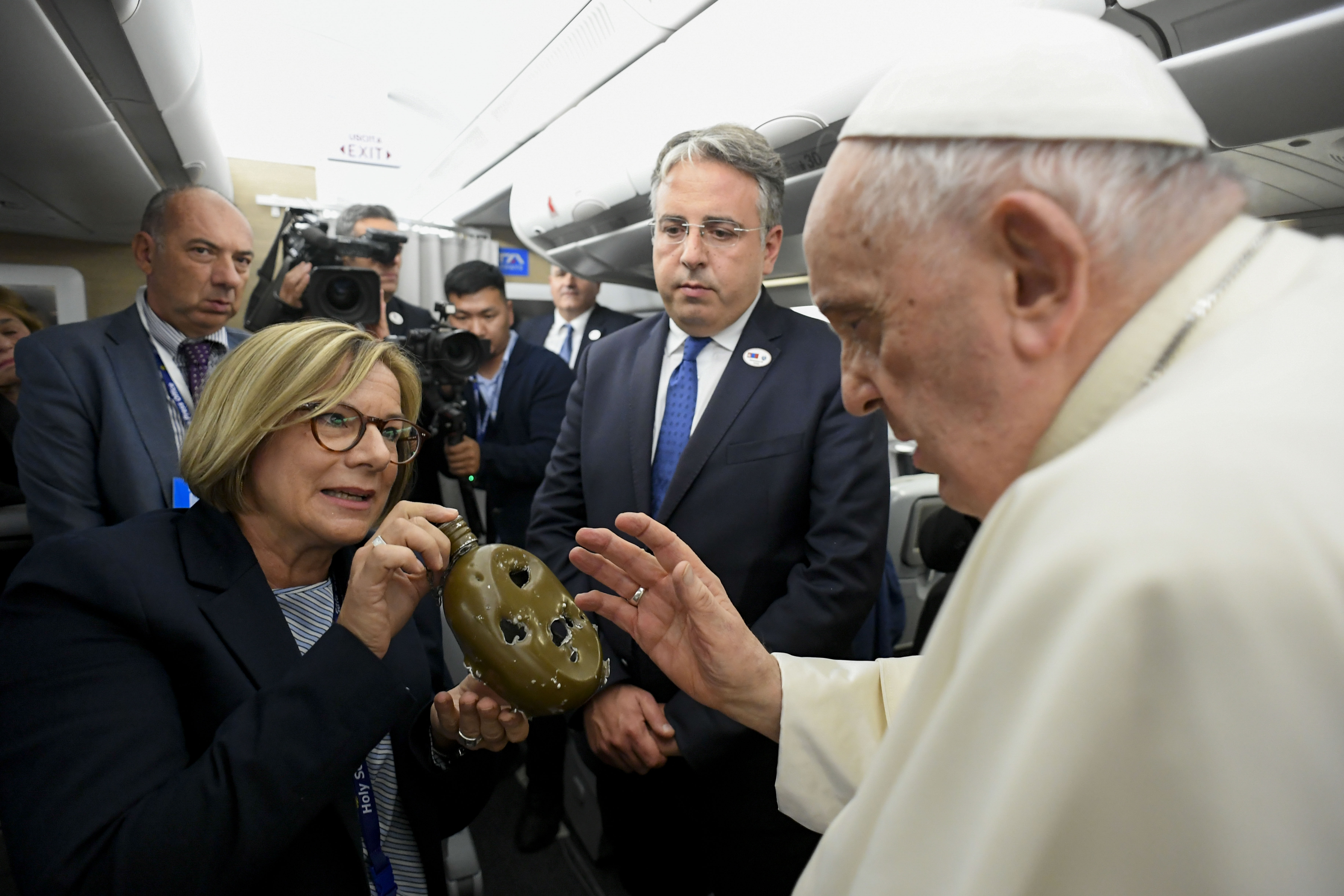 Durante il giro dei saluti ai giornalisti in volo con il Papa, gli è stata mostrata una borraccia: appartiene a un militare ucraino che si è salvato da una esplosione. Ha portato questo oggetto in una chiesa di Leopoli per ringraziare di essersi salvato. È stata la giornalista Eva Fernandez, di Radio Cope, a raccontare questa storia. Ne è venuta in possesso temporaneo perché la facesse vedere al Papa. Questo oggetto, con i segni della guerra scolpiti, sarà comunque riportato nella chiesa con la benedizione che in volo Francesco ha voluto dare.