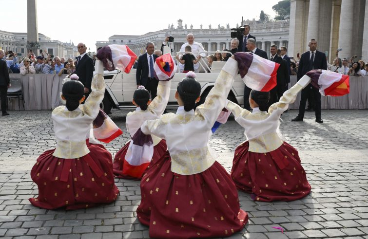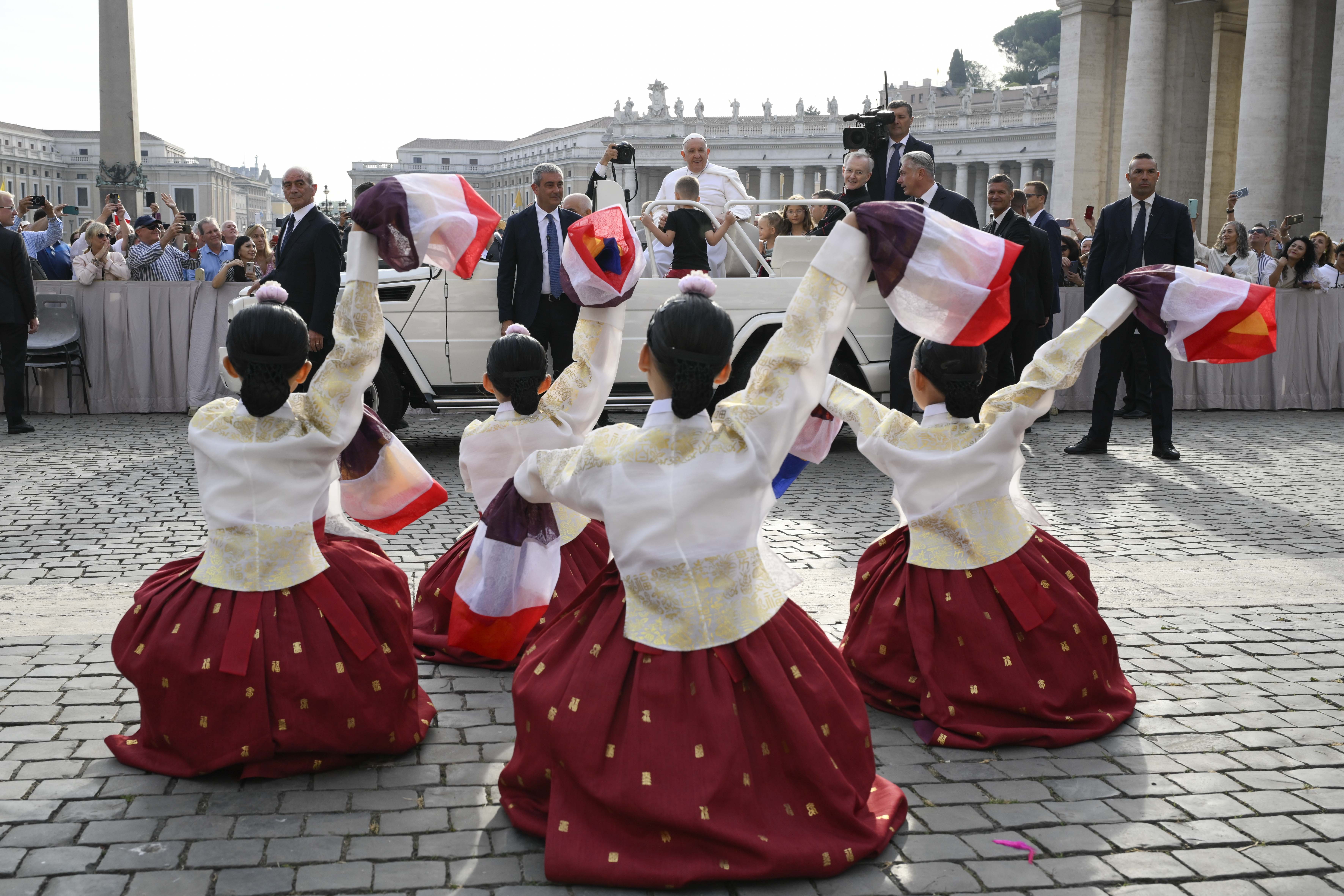 Sono quattro oggi i piccoli ospiti che si stano godendo, insieme al Papa, il giro tra i vari settori di piazza San Pietro che come di consueto fa da prologo alla catechesi del mercoledì. Moltissimi i bambini che Francesco ha salutato e accarezzato, grazie all’aiuto dei solerti uomini della Gendarmeria vaticana. Ai piedi del sagrato, un gruppo folkroristico di giovani in costume orientale che ha accompagnato il pre-udienza con alcuni “numeri” danzanti. Molto nutrita la folla di fedeli, nutriti degli immancabili telefonini per le foto e i selfie, che ha gremito gli ampi spazi delimitati dal colonnato del Bernini.