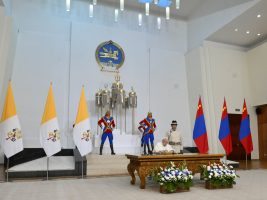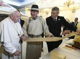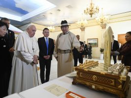 Dopo la firma del Libro d’Onore e la foto ufficiale, ha avuto luogo l’incontro privato cui fa seguito la presentazione della famiglia del presidente e lo scambio dei doni. Quindi il Santo Padre e il presidente si recano nella Sala Ikh Mongol per l’incontro con le autorità.