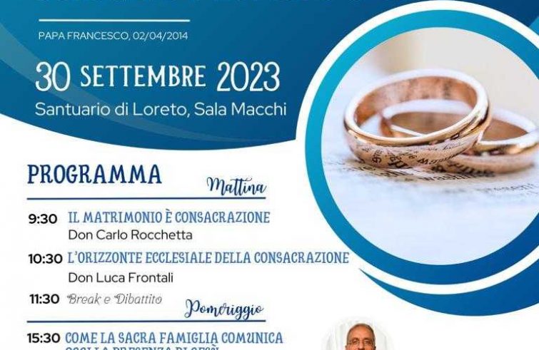 “E’ consacrazione: l’uomo e la donna sono consacrati nel loro amore”: è il titolo del convegno che si svolgerà il 30 settembre presso la Sala Pasquale Macchi del Santuario Pontificio della Santa Casa di Loreto, per iniziativa della chiesa locale. Il programma prevede l’inizio alle ore 9.30 con la relazione di don Carlo Rocchetta cui seguirà la relazione di don Luca Frontali. Nel pomeriggio alle 15.30 parlerà mons. Rafic Nahara, vicario patriarcale per Israele del patriarcato latino di Gerusalemme, cui seguirà la relazione di don Renzo Bonetti. La giornata di approfondimento si concluderà alle ore 18.30 con la Messa celebrata da mons. Fabio Dal Cin, arcivescovo prelato di Loreto Delegato pontificio.