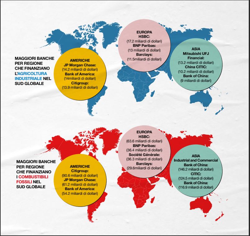 A sette anni dall’Accordo di Parigi sui cambiamenti climatici, l’analisi dei flussi finanziari in 134 Paesi del Sud globale mostra che le principali banche private mondiali hanno complessivamente investito 3,2 trilioni di dollari (1 trilione equivale a 1 miliardo di miliardi) nell’espansione dei combustibili fossili, mentre 370 miliardi di dollari sono i fondi destinati sotto forma di prestiti e garanzie all’agricoltura industriale. La crisi climatica sta ricevendo dalle banche private finanziamenti ben 20 volte superiori rispetto ai finanziamenti dei governi del nord del mondo per le soluzioni che potrebbero arginarla. È quanto emerge dal recente rapporto “How the finance flows” di ActionAid, che sottolinea il ruolo delle banche private mondiali nell’espansione all’industria dei combustibili fossili e all’agribusiness. Parallelamente, il sostegno finanziario dei governi del Nord a favore dei Paesi in prima linea nella crisi climatica è stato stimato in circa 21-24,5 miliardi di dollari nel 2020. “Uno squilibrio che sta gravemente danneggiando le comunità in Africa, Asia e America Latina”, afferma l’organizzazione umanitaria. Fra i gruppi bancari principalmente responsabili dei finanziamenti al settore dei combustibili fossili e dell’agribusiness figurano tra le altre HSBC, BNP Paribas, Barclays, Citibank, JPMorgan Chase e Mitsubishi UFJ Financial, con sede negli Stati Uniti, in Europa, in Cina e in Giappone. Ad esempio, HSBC emerge come la principale banca del settore dell’industria agroalimentare, con 17,2 miliardi di dollari destinati tra il 2016 e il 2022, seguita da JPMorgan Chase (14,2 miliardi di dollari), Bank of America (14 miliardi di dollari), Citigroup (13,9 miliardi di dollari) e Mitsubishi UFJ (13,2 miliardi di dollari). A beneficiare maggiormente dei finanziamenti per pratiche agricole industriali spicca la Bayer, che dal 2016 ha ricevuto circa 20,6 miliardi di dollari. Bayer – che possiede anche l’azienda di biotecnologie un tempo nota come Monsanto – è il secondo produttore mondiale di prodotti agrochimici, che a loro volta contribuiscono in modo determinante alle emissioni di gas a effetto serra. “Fiumi di denaro stanno fluendo nella direzione sbagliata, destinati più alle cause della crisi climatica che alle soluzioni. È inaccettabile che le banche più importanti al mondo dichiarino pubblicamente l’impegno sul clima, ma continuino a finanziare combustibili fossili e agricoltura industriale”, afferma Marco De Ponte, segretario generale di ActionAid Italia. Secondo ActionAid per affrontare l’emergenza climatica “è necessaria una trasformazione radicale dei sistemi energetici e alimentari: soluzioni come l’energia rinnovabile e l’agroecologia possono garantire il soddisfacimento delle esigenze locali di sicurezza alimentare, ridurre la deforestazione, limitare l’accaparramento di terre e sostenere i mezzi di sussistenza e le economie delle comunità del Sud globale”.