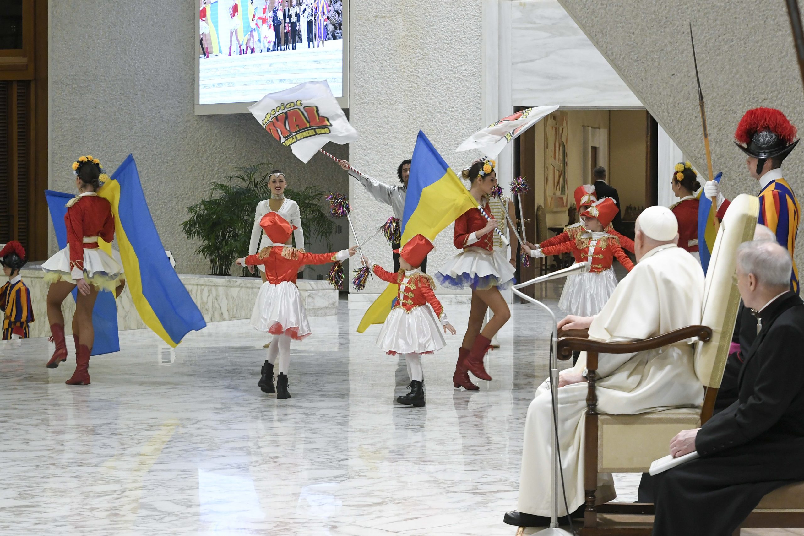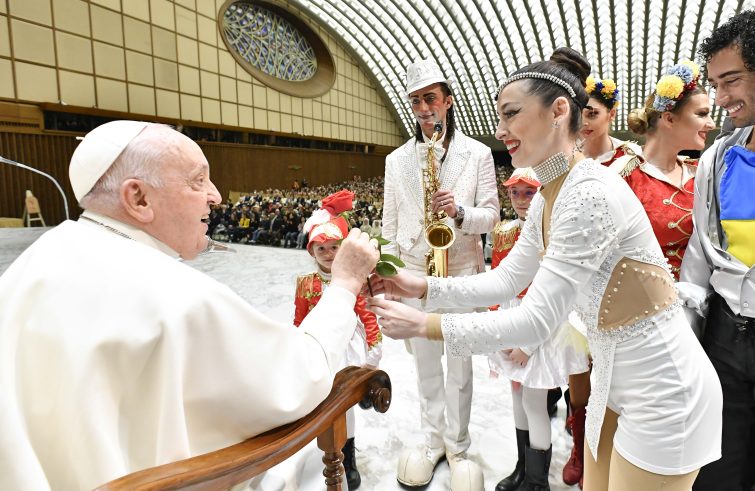 Al termine dell’udienza di oggi, prima dei saluti in lingua italiana – come aveva già annunciato il Papa, a braccio, all’inizio della catechesi in Aula Paolo VI – c’è stata l’esibizione di due diversi circhi, a cominciare da piccoli e grandi majorette che si sono esibite sul palco. Poi un ballerino, con una camicia con i colori giallo blu dell’Ucraina, ha fatto un numero danzante in assolo, seguito da un numero di coppia ad opera di altri due danzatori. Papa Francesco ha seguito tutto attentamente, sorridendo a più riprese, salutando al termine del numero tutti i piccoli e grandi artisti.