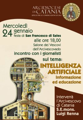 “Intelligenza artificiale e sapienza del cuore, informazione ed educazione”. È il tema dell’incontro che propone domani l’arcidiocesi di Catania ispirandosi al tema del Messaggio di Papa Francesco per la Giornata mondiale delle comunicazioni sociali 2024: “Intelligenza artificiale e sapienza del cuore: per una comunicazione pienamente umana”. L’iniziativa vuol essere “un momento speciale dedicato ai giornalisti in occasione della festa di San Francesco di Sales”, spiega l’Ufficio diocesano per le comunicazioni sociali in una nota. L’appuntamento è alle ore 18 all’interno del salone dei vescovi in arcivescovado.