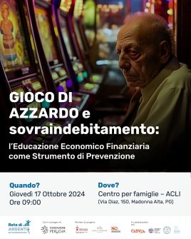 “Gioco di azzardo e sovraindebitamento: l’educazione economico finanziaria come strumento di prevenzione”. È il titolo dell’incontro di sensibilizzazione su un preoccupante fenomeno che riguarda un’ampia fascia di età, in particolare gli over 65, in programma giovedì 17 ottobre, alle ore 9, a Perugia, presso il “Centro per le famiglie – Acli”, in via Diaz, 150.