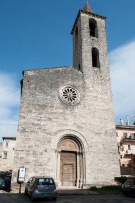 La chiesa fu costruita dopo l’anno 1250 con l’impiego del travertino. Rappresenta un buon esempio di architettura romanica proponendone le caratteristiche strutturali come la facciata aperta dal rosone formato da dodici colonnette e sovrastato da cinque scodelle maiolicate disposte e forma di croce. Probabilmente già all’inizio del XIV secolo fu completata ed arricchita con l’aggiunta di due eleganti portali e la costruzione del campanile che ne caratterizza la struttura armonizzandola con le altre, vicine, torri gentilizie e campanarie.