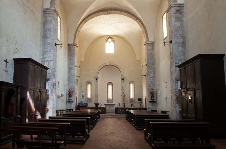 La chiesa fu costruita dopo l’anno 1250 con l’impiego del travertino. Rappresenta un buon esempio di architettura romanica proponendone le caratteristiche strutturali come la facciata aperta dal rosone formato da dodici colonnette e sovrastato da cinque scodelle maiolicate disposte e forma di croce. Probabilmente già all’inizio del XIV secolo fu completata ed arricchita con l’aggiunta di due eleganti portali e la costruzione del campanile che ne caratterizza la struttura armonizzandola con le altre, vicine, torri gentilizie e campanarie.