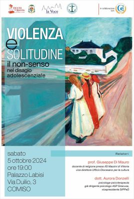 Sospesi in una dimensione di silenzio, ognuno perso nei propri pensieri. Anche se fisicamente vicini, le loro posture e i loro sguardi non comunicano una connessione reciproca: ognuno è isolato nel proprio mondo interiore. Ma sono davvero in ascolto di tale interiorità? Questi gli adolescenti ritratti nel celebre quadro di Munch “Il grido interiore”, icona della tavola rotonda organizzata dall’Ufficio per la cultura della diocesi di Ragusa, l’Associazione “La Voce” e l’Associazione di promozione sociale “Calicantus” di Comiso, in collaborazione con l’IIS “G. Carducci” di Comiso. Il tema “Violenza e solitudine: il non-senso nel disagio adolescenziale” sarà sviluppato da Giuseppe Di Mauro, docente di religione presso il Liceo Scientifico dell’IIS Mazzini di Vittoria e vicedirettore dell’Ufficio per la cultura, da Aurora Donzelli, psicologo-psicoterapeuta già dirigente psicologo ASP Siracusa e vicepresidente SIPPed, in dialogo con gli studenti del Liceo classico e scientifico dell’IIS“G. Carducci” di Comiso e il pubblico.