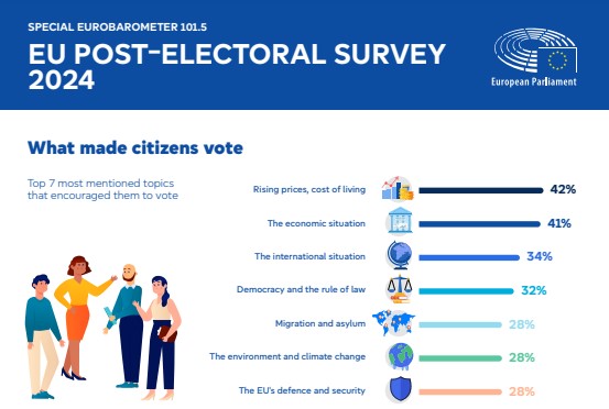 What reasons made voters go to the polls in their respective countries to renew the European Parliament last June? What is the current level of trust among European citizens regarding democracy and the future of the EU? And what do the citizens of the 27 EU Member States expect from European policies? These are some of the questions that the EU post-electoral Eurobarometer survey, released today, tries to answer, analysing the voting behaviour and the main priorities of citizens. “The rising prices and cost of living (42%) and the economic situation (41%) were the main reasons that prompted European citizens to vote in the European elections in June this year”, according to the extensive Eurobarometer report. A third of voters (34%) said that the international situation was a significant factor in their decision to go to the polls, while a similar percentage cited the defence of democracy and the rule of law (32%). Those who did not vote also believe that the cost of living (46%) and the economic situation (36%) could have motivated them to participate in the elections. “For Italians, too, the economic situation and the cost of living are confirmed as the most important reasons that prompted them to go to the polls in June, with values however higher than the EU average – 51% and 48% respectively”. This is followed by the international situation (35%) and the defence of democracy and the rule of law (29%). Even among Italians who did not vote, the perception of concerns related to the cost of living (51%) and the economic situation (48%) is higher than the EU average.