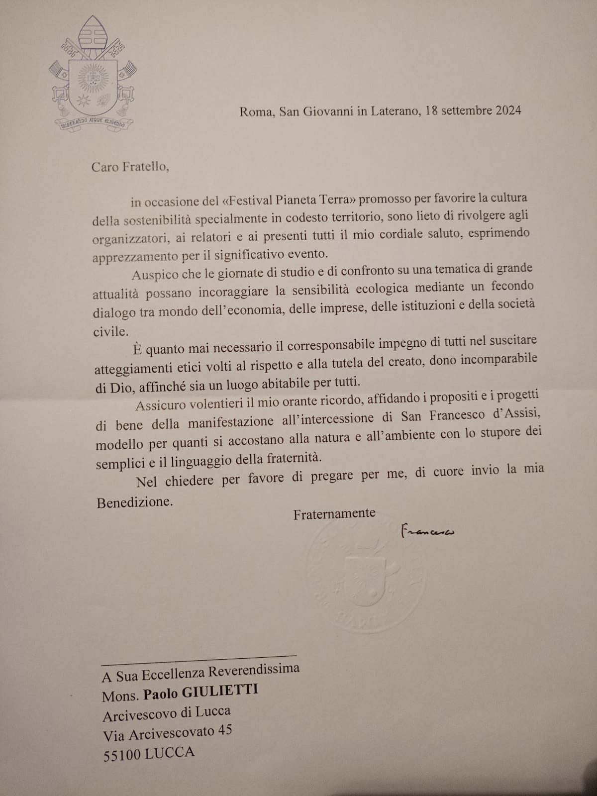 “Caro Fratello, in occasione del Festival Pianeta Terra promosso per favorire la cultura della sostenibilità specialmente in codesto territorio – dice il Papa -, sono lieto di rivolgere agli organizzatori, ai relatori e ai presenti tutti il mio cordiale saluto, esprimendo apprezzamento per il significativo evento. Auspico che le giornate di studio e di confronto su una tematica di grande attualità possano incoraggiare la sensibilità ecologica mediante un fecondo dialogo tra mondo dell’economia, delle imprese, delle istituzioni e della società civile”. Papa Francesco assicura il suo “orante ricordo, affidando i propositi e i progetti di bene della manifestazione all’intercessione di San Francesco d’Assisi, modello per quanti si accostano alla natura e all’ambiente con lo stupore dei semplici e il linguaggio della fraternità. Nel chiedere per favore di pregare per me, di cuore invio la mia Benedizione”.