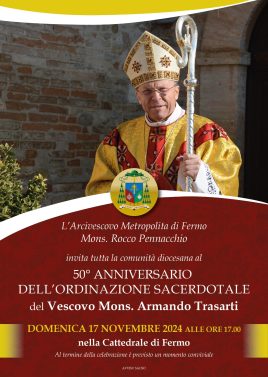 Domenica 17 novembre nella cattedrale di Fermo, si celebreranno i 50 anni di sacerdozio di mons. Armando Trasarti, vescovo emerito di Fano-Fossombrone-Cagli-Pergola. Era il 1° novembre 1974, nella solennità di tutti i Santi, quando Armando Trasarti, dell’arcidiocesi di fermo, veniva consacrato presbitero. Per l’occasione, domenica alle ore 17 in duomo, la Chiesa diocesana di Fermo si riunirà insieme all’arcivescovo Rocco Pennacchio per festeggiare “l’importante traguardo raggiunto dal vescovo Trasarti”.