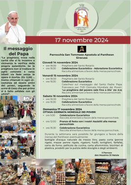 In occasione della Giornata mondiale dei poveri che si celebra domani in tutto il mondo, nella parrocchia San Tommaso Apostolo al Pantheon di Siracusa oggi alle 18 vi sarà la preghiera del rosario, e alle 18.30 la celebrazione eucaristica. Al termine, raccolta alimentare a favore della mensa parrocchiale. Domani alle 9.30 si svolgerà la celebrazione eucaristica e la raccolta alimentare a favore della mensa. Alle 12 pranzo di festa alla mensa parrocchiale. Alle 18.30 celebrazione eucaristica.