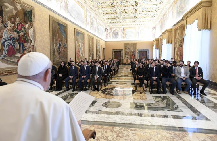 Francesco ha colto l’occasione per “consegnarvi la cosa più importante, quella verità che per un cristiano non dovrebbe essere mai taciuta. È un annuncio che riguarda tutti, giovani e anziani, e che abbiamo sempre bisogno di riascoltare: ‘Dio ti ama’, ‘Cristo ti salva’, ‘Egli vive!’. Se Egli vive, allora la speranza non è vana”. “Il male, il pessimismo, lo scetticismo – ha assicurato – non avranno l’ultima parola”. “E tanti giovani cadono in questo scetticismo, pure sostenuto dalla droga”, ha notato, evidenziando che “la speranza, lo stato d’animo in cui oggi i giovani italiani si riconoscono maggiormente, per noi cristiani ha un nome e un volto: il volto del Signore, il volto di Gesù”. “Di fronte alle sfide e alle difficoltà che potrete incontrare nel vostro lavoro, non temete! Non abbiate paura di attraversare anche i conflitti”, l’esortazione del Papa. E “il conflitto è come un labirinto: dal labirinto non si può uscire da soli, si esce in compagnia di un altro che ci aiuti. Primo. E dal labirinto si esce dall’alto”, ha spiegato il Papa, secondo cui “invecchiare in un labirinto è invecchiare nei valori superficiali. È triste vedere un uomo o una donna, giovane, che vive la sua vita nella superficialità. È molto triste…”. Di fronte ai conflitti “serve la pazienza di trasformarli in capacità di ascolto, di riconoscimento dell’altro, di crescita reciproca. Provare a superare i conflitti è il segno che abbiamo puntato più in alto, più in alto dei nostri interessi particolari, per uscire dalle sabbie mobili dell’inimicizia sociale”. “Andate avanti nel vostro servizio: cercare, custodire e portare la voce e la speranza dei giovani italiani nelle sedi istituzionali per partecipare insieme al bene comune”, l’invito del Papa che ha voluto affidare i giovani “al beato Pier Giorgio Frassati. Lo conoscete?”. “È un giovane come voi – ha spiegato –, che ha testimoniato con la vita la gioia del Vangelo. Vi invito a conoscerlo e imitare la sua coerenza e il suo coraggio, la sua gioia. Buon cammino a tutti e buon lavoro!”.