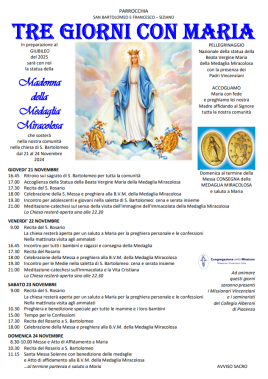 Dal 21 al 24 novembre il Pellegrinaggio nazionale della statua della Vergine della Medaglia Miracolosa fa tappa a Siziano (PV). Ad animare questi giorni saranno presenti i Missionari Vincenziani e i seminaristi del Collegio Alberoni di Piacenza. Il programma della “Tre giorni con Maria” prevede per giovedì 21 novembre: ore 16,45 ritrovo sul sagrato di San Bartolomeo per tutta la comunità; ore 17 accoglienza statua Beata Vergine Maria della Medaglia Miracolosa; ore 17,30 recita del rosario; ore 18 messa e preghiera alla B.V.M. della Medaglia Miracolosa; ore 19,30 incontro per adolescenti e giovani nella saletta di San Bartolomeo con cena e serata insieme; ore 21 meditazione-catechesi sul senso della visita dell’immagine dell’Immacolata della Medaglia Miracolosa. Venerdì 22 novembre alle ore 9 la recita del rosario e, nella mattinata, visita gli ammalati. Ore 16,45 incontro per tutti i bambini ragazzi e consegna della Medaglia; ore 17,30 recita del rosario; ore 18 messa e preghiera alla B.V.M. della Medaglia Miracolosa; ore 19,30 incontro per le scuole medie nella saletta di San Bartolomeo: cena e serata insieme; ore 21 meditazione-catechesi sull’Immacolata e la vita cristiana. Sabato 23 novembre alle ore 9 recita rosario e, nella mattinata, visita agli ammalati. Ore 10,30 preghiera e benedizione speciale per tutte le mamme e i loro bambini; ore 15 confessioni; ore 17,30 recita del rosario a San Bartolomeo; ore 18 messa e preghiera alla B.V.M. della Medaglia Miracolosa. Domenica 24 novembre alle ore 8,30 e alle ore 10 messa e atto di affidamento a Maria; alle ore 10,30 recita del rosario a San Bartolomeo; ore 11,15 messa solenne con benedizione delle medaglie e atto di affidamento alla B.V.M. della Medaglia Miracolosa. Al termine partenza e saluto a Maria.