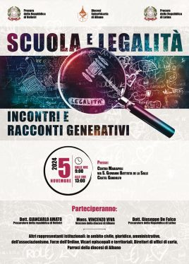 Si terrà martedì 5 novembre, dalle 9 alle 13, presso il Centro Convegni Mariapoli di Castel Gandolfo, la presentazione del Rapporto “Scuola e legalità: incontri e racconti generativi”, che contiene i dati sui percorsi educativi alla legalità avviati lo scorso anno nelle scuole di ogni ordine e grado del territorio diocesano, a partire dal progetto “Insieme è possibile”, a cura dell’Ufficio per l’educazione, la scuola e l’Irc, diretto da Gloria Conti, che ha visto la diocesi di Albano collaborare con le Procure di Velletri e di Latina e il Segretariato della Procura della Repubblica di Roma presso la Corte d’appello. Un evento per restituire ai territori, alle Istituzioni, agli amministratori locali, al mondo dell’associazionismo e alla Chiesa i primi frutti di un cammino che proseguirà anche negli anni a venire.
