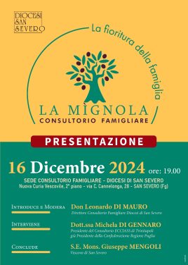 Sarà presentato in serata, alle 19, il Consultorio famigliare diocesano di San Severo (Foggia). L’evento, si terrà presso la nuova curia vescovile, in via Carmine Cannelonga 28. Interverranno: don Leonardo Di Mauro, direttore Consultorio famigliare della diocesi di San Severo; Michela Di Gennaro, presidente del Consultorio Ecciass di Trinitapoli; il vescovo Giuseppe Mengoli. “In questi precisi giorni, contrassegnati dal riacutizzarsi di vecchie e nuove tensioni, la Chiesa universale, con l’indizione dell’Anno giubilare ordinario per il 2025, non esita a riproporre all’uomo contemporaneo la speranza come la direzione e la finalità di tutta l’esistenza. All’unisono con la Chiesa universale, anche la Chiesa particolare di San Severo s’è messa in cammino lungo le strade di questa terra, per stringere cordialmente la mano alle donne e agli uomini che vorranno condividere i loro affanni e le loro gioie”, afferma don Leonardo Di Mauro. “È con questo spirito, come segno tangibile della speranza, la diocesi di San Severo inaugurerà il consultorio familiare, d’ispirazione cristiana, ‘La Mìgnola’”. Quest’opera-segno, oltre che “rappresentare uno spazio d’incontro, sarà un tempo in cui le persone si prenderanno cura di altre persone, ‘abitando con il cuore’ le case nelle quali è urgente entrare”.