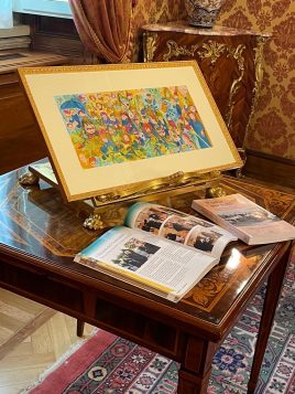 Al presidente della Repubblica sono stati donati la recente pubblicazione “Roma per tutti. Casa Santa Maria per le nostre ragazze”, a cura di Michela Carrozzino e Grazia Loparco, e un quadro realizzato da Gloria, “parca di parole ma un’artista nel cuore e nelle mani”, che raffigura volti di persone diverse, compreso quello di Mattarella.