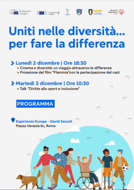 In occasione della Giornata internazionale dei diritti delle persone con disabilità, l’Ufficio del Parlamento europeo e la rappresentanza della Commissione europea in Italia organizzano un doppio appuntamento il 2 e 3 dicembre nell’Esperienza Europa – David Sassoli di Roma, con l’obiettivo di sensibilizzare l’opinione pubblica sull’inclusione sociale e sportiva. Oggi, dalle 18.30, la serata sarà dedicata al cinema sociale con la proiezione del lungometraggio “Flaminia” (2024) della regista, sceneggiatrice, attrice e comica Michela Giraud. L’artista parteciperà anche al dibattito “Cinema e diversità: un viaggio attraverso le differenze” con l’attrice e regista Sabrina Paravicini e suo figlio Nino Monteleone, nello spettro autistico, che parleranno del loro documentario “Be Kind – Un viaggio gentile nella diversità”. Presenti alla serata gli attori Edoardo Purgatori e Rita Abela, e gli sceneggiatori del film “Flaminia”, Francesco Marioni e Greta Scicchitano. L’incontro verrà aperto dai saluti dell’eurodeputata Chiara Gemma, modererà la conduttrice Roberta Ammendola. Martedì 3 dicembre, alle 10.30, è in programma il talk “Diritto allo sport e inclusione”, con la partecipazione di atleti paralimpici, attivisti, e rappresentanti di diverse federazioni e associazioni sportive. Tra loro Damiano Marini, campione paralimpico di handbike, Gabriele Di Bello, nuotatore e attore, Dong Dong Camanni, campione paralimpico di judo, Sandro Di Girolamo, presidente della Federazione italiana sport paralimpici per ipovedenti e ciechi (Fispic), Anna Rita Casolini Di Sersale, responsabile regionale per il Lazio dell’Area famiglie dell’associazione Special Olympics Italia, Matteo De Lorenzo, rappresentate di Ciampacavallo Asd/Aps e Gianluca Di Lorenzo, cofondatore di Frolla Microbiscottificio e vincitore nel 2021 del Premio del cittadino europeo, Lorenzo Bernard, campione paraolimpico e vittima civile di guerra Anvcg. Ci saranno anche i Talents, cinque giovani padovani nello spettro autistico – Enrico Balestra, Nicola Barzon, Ludovico Lancia, Enrico Ortile e Alessandro Padrin – finiti sotto i riflettori grazie a un’intuizione creativa: costruire rampe di Lego per abbattere le barriere architettoniche. Alle 12 il panel “Il Calcio é di tutti”, con gli interventi di Giancarlo Abete, presidente della Lega nazionale dilettanti (Lnd), Franco Carraro, presidente Divisione calcio paralimpico e sperimentale della Figc, e Luca Pancalli, presidente del Comitato italiano paralimpico (Cip). La giornata moderata da Metis Di Meo, sarà aperta da un videomessaggio della vicepresidente del Parlamento europeo Antonella Sberna e dai saluti degli eurodeputati Salvatore De Meo, Susanna Ceccardi e del direttore dell’Ufficio del Parlamento europeo in Italia Carlo Corazza.