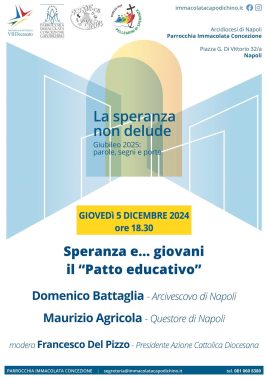 In un’epoca di sfide e incertezze, la parrocchia Immacolata Concezione di Napoli, in piazza G. Di Vittorio 32/a accende un faro di speranza per il futuro, organizzando l’evento “Speranza e… giovani: il Patto educativo”. L’iniziativa, che si inserisce nel più ampio contesto degli incontri giubilari dal tema “Parole, segni e porte”, è in programma domani, giovedì 5 dicembre, alle ore 18.30.