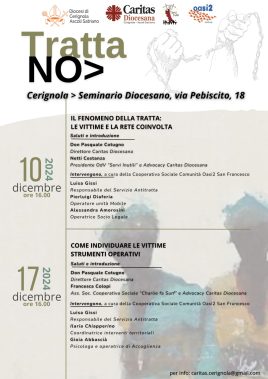 Si svolgeranno nei giorni di martedì 10 e 17 dicembre, a partire dalle 16 nel salone del Seminario diocesano a Cerignola, due incontri formativi sul tema della tratta e dello sfruttamento. I due incontri sono stati organizzati dalla Caritas diocesana di Cerignola-Ascoli Satriano e dal braccio operativo, l’Odv “Servi inutili”, in collaborazione con la cooperativa sociale “Comunità Oasi2 San Francesco” di Trani, come frutto di un protocollo d’intesa operativo stipulato nei mesi scorsi. Durante il primo incontro, dopo i saluti del direttore della Caritas diocesana, don Pasquale Cotugno, seguirà l’introduzione sul tema dell’advocacy in Caritas, da parte di Costanza Netti, presidente di “Servi inutili”, mentre il 17 dicembre l’introduzione sarà affidata all’assistente sociale Francesca Colopi. A seguire, saranno trattate le tematiche nel dettaglio, a cura degli esperti Cooperativa sociale “Comunità Oasi2 San Francesco”.