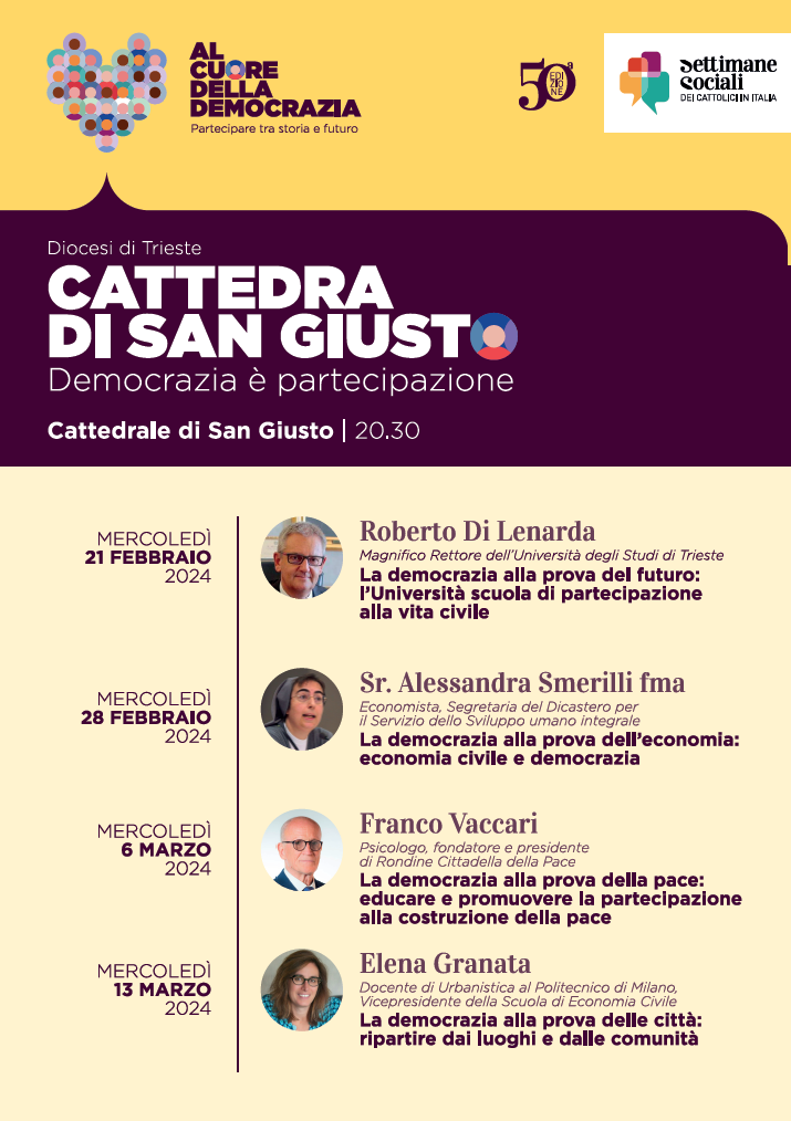 E’ stata presentata questa mattina alla curia di Trieste la “Cattedra di San Giusto – Quaresima 2024” dedicata al tema “Democrazia è Partecipazione. In vista della Settimana Sociale dei Cattolici in Italia, 3-7 luglio 2024”. Gli appuntamenti che la diocesi di Trieste propone dal 2010, principalmente nel tempo di Quaresima, per approfondire temi di spiritualità e cultura ecclesiale con testimoni qualificati, sono stati presentati dal vescovo di Trieste, mons. Enrico Trevisi, assieme a Giovanni Grandi, docente dell’Università di Trieste e membro del Comitato scientifico per la 50ª Settimana sociale, e don Sergio Frausin, delegato diocesano per la Cultura. La Cattedra di San Giusto si presenta quest’anno con un programma che accompagna la comunità ecclesiale e cittadina alla 50a Settimana Sociale dei Cattolici in Italia. Tutti gli incontri si svolgeranno nella Cattedrale di San Giusto dalle ore 20,30 ad ingresso libero, partendo da mercoledì 21 febbraio alle ore 20,30 con l’incontro “La democrazia alla prova del futuro: l’Università scuola di partecipazione alla vita civile” tenuto da Roberto Di Lenarda, rettore dell’Università degli Studi di Trieste. Seguirà poi il 28 febbraio l’incontro “La democrazia alla prova dell’economia: economia civile e democrazia” con suor Alessandra Smerilli fma, economista, membro del comitato scientifico di Economy of Francesco, segretaria del Dicastero vaticano per il servizio dello sviluppo umano integrale. Mercoledì 6 marzo sarà la volta di “La democrazia alla prova della pace – Educare e promuovere la partecipazione alla costruzione della pace”, con Franco Vaccari, psicologo, fondatore e presidente di Rondine Cittadella della pace. Mercoledì 13 marzo è previsto invece l’incontro “La democrazia alla prova delle città. Ripartire dai luoghi e dalle comunità”, con Elena Granata, docente di urbanistica al Politecnico di Milano, vicepresidente della Scuola di economia civile.