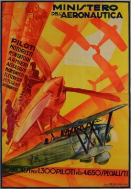 “Uno slancio, un salto di livello e di valori che si evidenzia in pittura quanto nella grafica pubblicitaria – anticipa Pasqualin -. Permangono i colori accesi e contrastanti che già erano in uso nella prima fase della grafica futurista, ma il lettering diventa meno predominante, partecipa ancora al movimento e alle linee presenti nel manifesto, ma torna anche ad essere corredo esplicativo delle immagini. Aumenta, naturalmente, il numero di manifesti incentrati sul tema del volo e delle manifestazioni aereonautiche”.