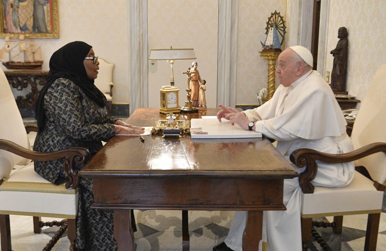 È durato circa 25 minuti il colloquio privato il Papa e la presidente della Repubblica Unita di Tanzania, Samia Suluhu Hassan, la quale ha successivamente incontrato il card. Pietro Parolin, segretario di Stato, accompagnato da mons. Paul Richard Gallagher, segretario per i Rapporti con gli Stati e le Organizzazioni internazionali. “Durante i cordiali colloqui in Segreteria di Stato – riferisce la Sala Stampa della Santa Sede – è stato espresso compiacimento per le buone relazioni esistenti tra la Santa Sede e la Tanzania. È stata richiamata, in particolare, l’importanza del ruolo che la Chiesa cattolica svolge nel Paese in favore della popolazione, specialmente negli ambiti caritativo, educativo e sanitario. Nel prosieguo della conversazione, ci si è soffermati su temi che riguardano il contesto sociale in Tanzania, e sulle sfide che il Paese è chiamato ad affrontare. Inoltre, vi è stato uno scambio di vedute sulla situazione regionale e sull’attualità internazionale, auspicando un impegno sempre maggiore nella promozione della pace”. Il Papa ha donato alla presidente una scultura in bronzo dal titolo “Dialogo tra generazioni”, oltre ai volumi dei documenti papali e al Messaggio per la Pace di quest’anno. La presidente ha donato al Pontefice una riproduzione di una porta tipica di Zanzibar, opera di artigianato locale, e una croce con una pietra di tanzanite.
