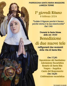 Domani sera, quindi, inizia il cammino di preparazione alla festa di Santa Rita da Cascia che lo scorso anno è stata eletta a patrona della parrocchia e durante la celebrazione eucaristica, preceduta alle ore 17.30 dall’adorazione eucaristica, dal rosario ritano e dal vespro, ci sarà la benedizione di due nuove tele dell’artista Matteo Curcio, raffiguranti due momenti della vita della Santa umbra, che saranno poi collocate nei due cornicioni ai lati del presbiterio.