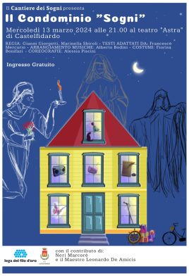 Mercoledì 13 marzo, alle ore 21, presso il Teatro Astra di Castelfidardo (An), va in scena lo spettacolo “Il Condominio Sogni”, una produzione della compagnia Il Cantiere dei Sogni, per la regia di Gianni Giorgetti e Marinella Sbiroli, con l’adattamento testi di Francesco Mercurio, l’arrangiamento musicale di Alberto Bodini, i costumi di Fiorisa Bonifazi e le coreografie di Alessia Piscini.