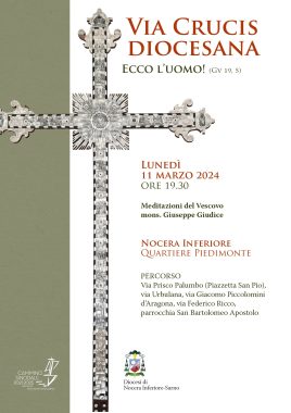 Via Crucis diocesana a Nocera Inferiore: il momento di preghiera e meditazione è in programma oggi, lunedì 11 marzo, al quartiere Piedimonte. Il pio esercizio attraverserà alcune strade che ricadono nella parrocchia San Bartolomeo Apostolo.