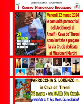 Venerdì 22 marzo, l’arcivescovo di Amalfi-Cava de’ Tirreni, mons. Orazio Soricelli, invita la Chiesa diocesana ad un momento di riflessione e di preghiera per i missionari martiri, in occasione della Giornata dei missionari martiri. La Via Crucis si terrà quest’anno nella parrocchia di San Lorenzo Martire in Cava, alle 20. Si pregherà per i missionari ma anche per tutti coloro che, in forza del battesimo sono chiamati non solo a partecipare al sacerdozio comune ma anche ad essere missionari, testimoni del Risorto nel mondo con la propria vita. Sarà un momento nel quale, come ricorda sovente l’arcivescovo Soricelli, la Chiesa diocesana ricorderà a se stessa di dover essere sempre in uscita verso i nuovi orizzonti geografici, sociali, esistenziali, verso i luoghi e le situazioni umane di confine. I martiri ci sono anche oggi come nei primi secoli della Chiesa e muoiono perché sono segno di contraddizione in mondi, luoghi, civiltà, culture dove non sono tollerati, dove non è tollerato l’amore di Cristo che perdona sempre e ridà fiducia all’uomo anche se disperato, profugo, per alcuni destinato soltanto ad essere scartato.