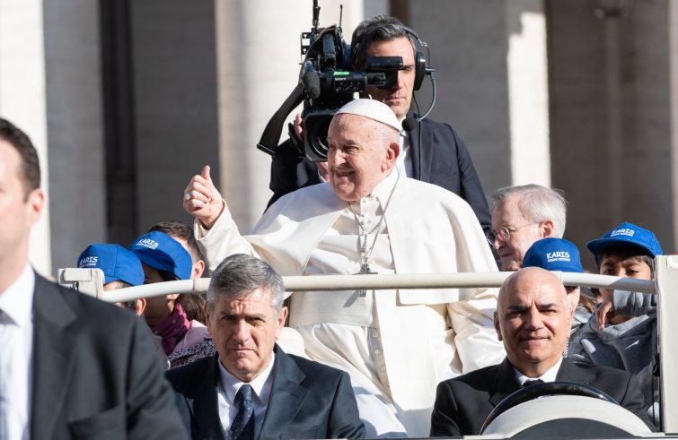 Papa Francesco è arrivato oggi in piazza San Pietro alle 8.45 circa e subito ha preso a bordo con sé, nella jeep bianca scoperta, quattro bambini, maschi e femmine, caratterizzati da un cappellino blu, che si sono goduti il giro sulla papamobile tra i vari settori della piazza delimitata dal colonnato del Bernini, grazie anche alla giornata romana soleggiata e dal clima di primavera. Moltissimi i fedeli che si sono accalcati sulle transenne per poter “guadagnare” una postazione migliore per foto o selfie al passaggio del Papa, che terminato il giro, prima di percorrere sulla jeep il breve tragitto che lo conduce alla sua postazione al centro del sagrato, si è congedato dai suoi piccoli ospiti salutandoli uno ad uno.