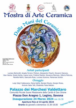 Con i patrocini della diocesi di Savona-Noli, del Comune e dell’Associazione Liguri nel Mondo dal 24 marzo al 14 aprile nell’atrio di Villa Valdettaro, sede delle Piccole Suore Missionarie della Carità (Opera Don Orione), in piazza don Nicolò Aragno 1, nel quartiere Legino, è visitabile la mostra “Dalle Mani del Ceramista”, ideata e organizzata dall’Associazione Culturale “Renzo Aiolfi”. In esposizione due opere per ogni artista partecipante e alcuni omaggi a significativi artisti che hanno usato la ceramica con esiti originali: Luigi “Gigi” Caldanzano, Maria Galfrè, Giorgio Moiso, Saba Telli, Elisabetta Testa Bottaro e Renata Minuto. L’allestimento è il primo evento che ricorda quest’ultima, recentemente scomparsa, come sensibile sperimentatrice e unica artista donna presente nei Giardini Vaticani con una monumentale opera dedicata a Nostra Signora di Misericordia. Ci sono inoltre altre “voci” singolari della scuola ceramica di Albisola e Savona: sono presenti Cristina Mantisi, Alessandro Fieschi, Grazia Genta, Angela “Tatina” Ferrero e il decano Gian Genta. Seguono Luciana Bertorelli, Luana Lenzi, Giovanna Marrone, Vittorio Patrone, Mariella Relini, Giancarla Roso, Luciana Scarone, Mariarosa Scerbo e il maestro Giovanni Garozzo. La mostra è aperta al pubblico dal giovedì alla domenica dalle ore 15:30 alle 18 con ingresso libero. L’inaugurazione è in programma il 24 marzo alle 16:30 alla presenza del vescovo Calogero Marino. Per informazioni è possibile contattare l’associazione chiamando il numero di telefono 3356762773, scrivendo all’indirizzo e-mail ass.aiolfi@libero.it o consultando il sito web aiolficultura.blogspot.it.