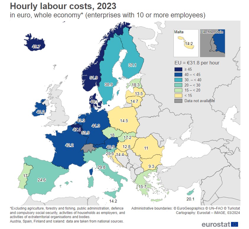Nel 2023, il costo orario medio del lavoro è stato di 31,8 euro nell’Ue e di 35,6 euro nell’eurozona. Se si srotola la media su base geografica, si trovano in fondo alla classifica la Bulgaria (con un costo medio di 9,3 euro), la Romania (11) e l’Ungheria (12,8), mentre in cima ci sono Lussemburgo (53,9 euro), Danimarca (48,1) e Belgio (47,1). Se invece si srotola la media per settori, emerge che il costo orario del lavoro nell’industria è stato di 32,2 euro nell’Ue e di 38 euro nell’eurozona; nell’edilizia il costo era inferiore, rispettivamente 28,5 e 31,9 euro. Nei servizi, il costo orario del lavoro varia tra 31,8 euro dell’Ue e 34,8 euro nell’eurozona. Nei settori non imprenditoriali (esclusa la pubblica amministrazione), la media era rispettivamente di 32,4 e 35,7 euro. I costi non salariali (come i contributi a carico dei datori di lavoro) incidono per il 24,7% sul costo complessivo nell’Ue e per il 25,5% nell’eurozona. Anche qui si va da un minimo di Malta (1,4%), Romania (5,0%) e Lituania (5,4%) fino al massimo di Svezia (32,2%) e Francia (31,9%). Il costo orario del lavoro nel 2023 è aumentato in tutti i Paesi, con una media del 5,3% nell’Ue e del 4,8% nell’eurozona rispetto al 2022. Gli aumenti maggiori tra i Paesi euro sono stati registrati in Croazia (+14,2%), Lituania (+12,4%) ed Estonia (+11,7%). Per i Paesi non euro, gli aumenti maggiori sono stati registrati in Ungheria (+17,0%), Romania (+16,5%), Bulgaria (+14,0%) e Polonia (+12,4%). L’aumento minore è stato registrato in Danimarca (+2,7%). I dati sono riportati in uno studio di Eurostat diffuso oggi.