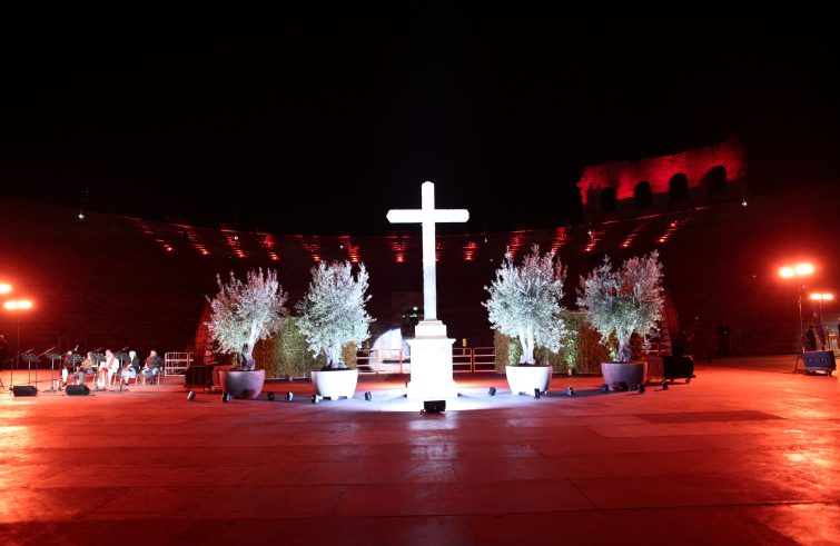 I 5mila spettatori che affolleranno le gradinate dell’anfiteatro saranno coinvolti nel dramma in atto; la serata sarà anche un’occasione concreta di solidarietà: sarà possibile contribuire alla “Colletta pro locis sanctis” del Venerdì Santo per sostenere la Chiesa di Terra Santa.