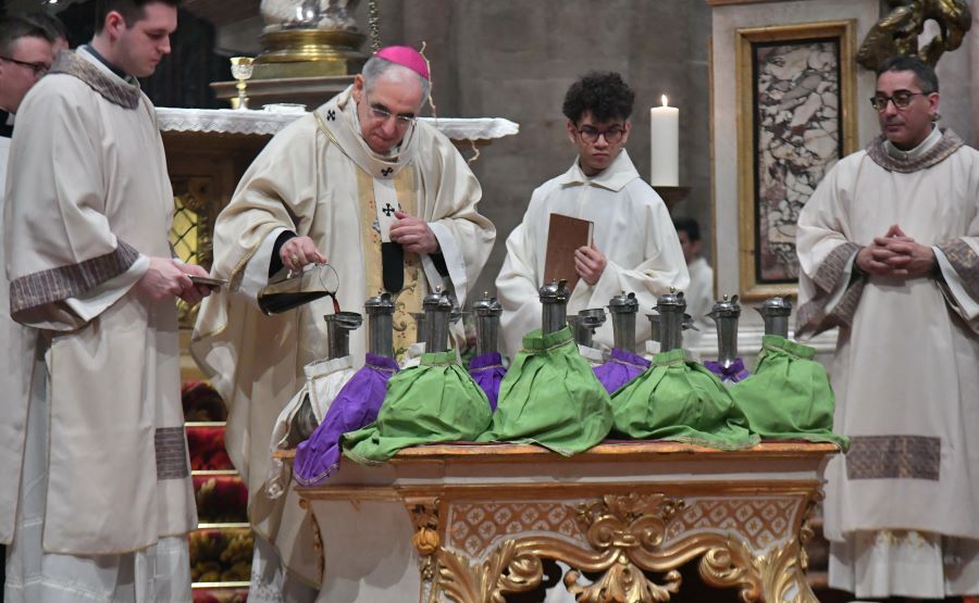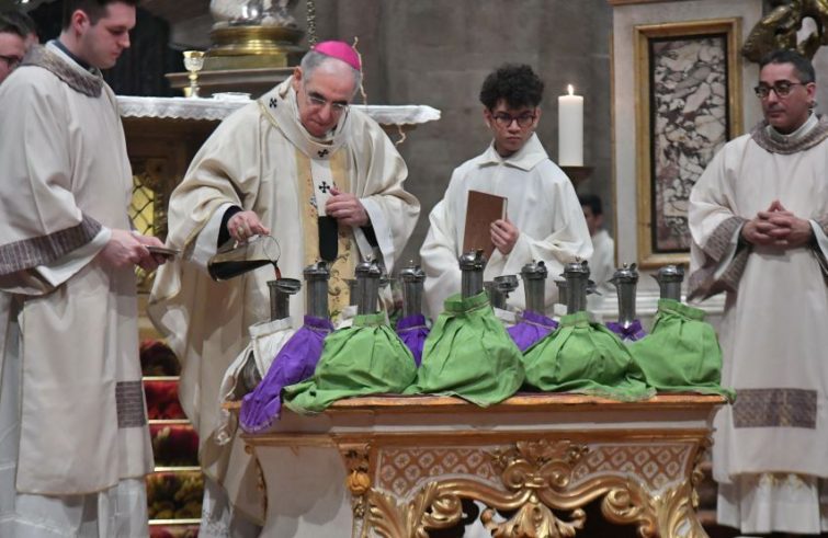 Nella liturgia odierna, nella quale i preti presenti hanno rinnovato le promesse del giorno della loro ordinazione, sono stati benedetti anche gli oli santi: l’olio del crisma (da cui prende nome la Messa, usato nel conferimento di battesimo, cresima e nelle ordinazioni sacre), l’olio dei catecumeni (coloro che si preparano al battesimo) e l’olio per l’unzione degli infermi.