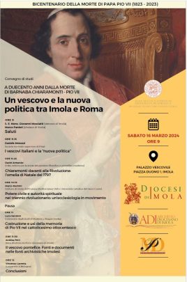 A duecento anni dalla morte di Barnaba Chiaramonti, vescovo di Imola dal 1785 al 1816 ed eletto Papa col nome di Pio VII il 14 marzo 1800, sabato 16 marzo a partire dalle ore 9 nel Palazzo vescovile di Imola (piazza Duomo 1) si svolgerà il convegno “Un vescovo e la nuova politica tra Imola e Roma”. Aprono i lavori i saluti del vescovo di Imola, mons. Giovanni Mosciatti, e del sindaco di Imola, Marco Panieri.